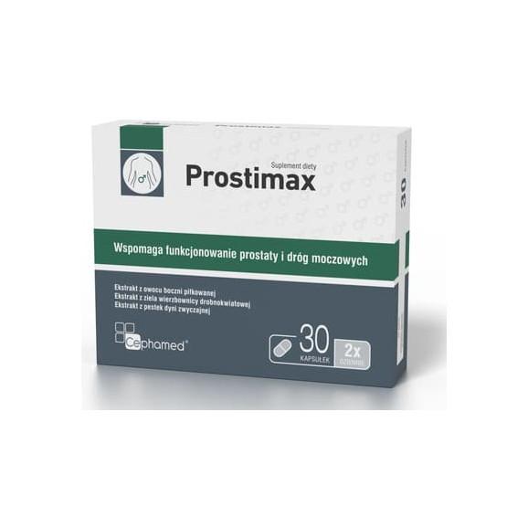 Prostimax to suplement diety w postaci kapsułek. Produkt zawiera w swoim składzie ekstrakty roślinne, witaminę E, cynk oraz witaminę B6. Ekstrakt z ziela wierzbownicy oraz z owoców boczni piłkowanej wspomaga prawidłowe funkcjonowanie prostaty i dróg moczowych. Cynk pomaga w utrzymaniu prawidłowej płodności oraz prawidłowych funkcji rozrodczych. Witamina E pomaga w ochronie komórek przed stresem oksydacyjnym. Witamina B6 przyczynia się do zmniejszenia zmęczenia i znużenia.
