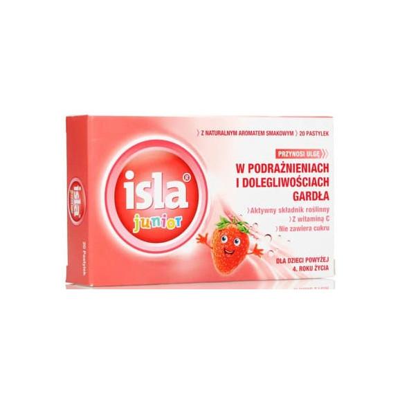 Isla Junior to wyrób medyczny w postaci pastylek do ssania o smaku truskawkowym przeznaczony dla dzieci po 4 roku życia. Isla Junior zawiera składniki, które chronią suchą i podrażnioną błonę śluzową jamy ustnej i krtani oraz pomagają zwalczyć dolegliwości gardła, takie jak drapanie w gardle i chrypka. Ekstrakt z porostu islandzkiego uwalnia się podczas ssania i tworzy powłokę ochronną, która działa jak balsam na podrażnioną błonę śluzową jamy ustnej, gardła i krtani. Dodatkowo preparat zawiera witaminę C, cynk i pantotenian wapnia.