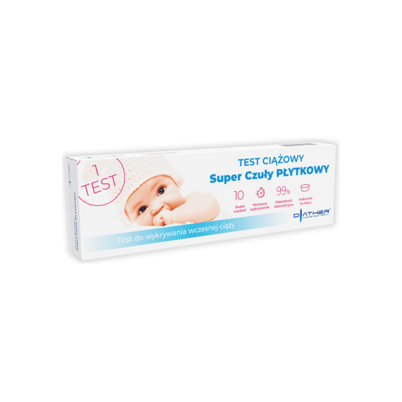 Test Diather Ciążowy domowy test do wykrywania wczesnej ciąży, czułość testu wynosi 10 mIU/ml. Szybki i wysoce czuły test ciążowy służący do wykrywania ludzkiej gonadotropiny kosmówkowej (hCG) – hormonu, który występuje w moczu kobiet w ciąży. Wynik w ciągu 5 minut. Zawartość opakowania: