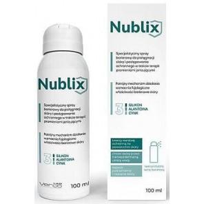 Silikonowy spray barierowy Nublix do pielęgnacji i ochrony skóry narażonej na działanie promieniowania jonizującego. Zalecany jest do codziennego użycia od pierwszego dnia napromieniania przez cały okres terapii. Produkt kosmetyczny Nublix jest transparentnym sprayem o neutralnym zapachu. Potrójny mechanizm działania wzmacnia fizjologiczne właściwości barierowe skóry: