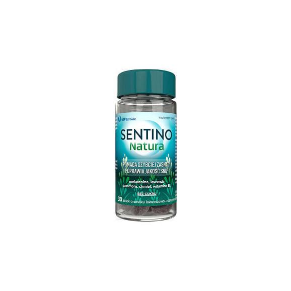 Sentino Natura to suplement diety w postaci żelek zawierający melatoninę, wyciąg z kwiatów męczennicy cielistej (Passiflora incarnata), wyciąg z szyszek chmielu zwyczajnego (Humulus lupulus), witaminę B6 i olejek lawendowy. Produkt przeznaczony dla osób dorosłych. Bez glutenu, laktozy i cukru, zawiera substancję słodzącą. Produkt odpowiedni dla wegetarian i wegan. Smak: lawendowo-różany. Melatonina wpływa na skrócenie czasu potrzebnego na zaśnięcie. Witamina B6 wpływa na zmniejszenie uczucia zmęczenia i znużenia oraz wspomaga pracę układu nerwowego.