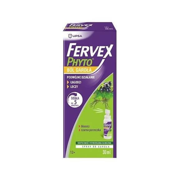 FERVEX PHYTO spray do gardła – wyrób medyczny w postaci lepkiego, hipertonicznego roztworu w sprayu do łagodzenia bólu gardła. Produkt przeznaczony dla osób dorosłych i dzieci po 12. roku życia. Spray po rozpyleniu na powierzchnię gardła tworzy aktywny osmotycznie, odporny film ochronny, który przyciąga mechanicznie hipotoniczny płyn z głębszych części gardła. Produkt powoduje odrywanie i wypłukiwanie zanieczyszczeń obecnych na powierzchni gardła, w tym bakterii, wolnych cząstek wirusowych, martwych komórek i pływających cząsteczek białka. Dodatkowo stymuluje regenerację błony śluzowej i mechanizmy ochronne.