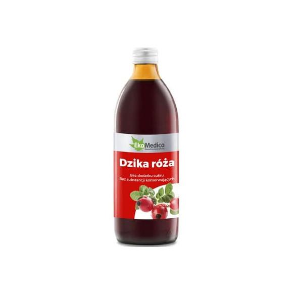 EkaMedica Dzika Róża to suplement diety w formie płynnej, wyprodukowany z soku 100 % z owoców dzikiej róży z dodatkiem naturalnej witaminy C pochodzącej z ekstraktu z owoców camu camu. Pasteryzowany. Owoce dzikiej róży to źródło witaminy C, zawierają również witaminy: A, B1, B2,E, K, flawonoidy, garbnik, kwasy organiczne, kwas jabłkowy, pektyny, sole mineralne, żelazo. Dzika róża korzystnie wpływa na utrzymanie odporności organizmu, wspiera leczenie podczas przeziębienia i grypy, korzystnie wpływa na układ sercowo-naczyniowy. Jest naturalnym źródłem witaminy C. Dzika róża może zawierać nawet 40% więcej witaminy C niż pozostałe owoce i warzywa Wiadomo również, że witamina C z naturalnego źródła jest lepiej przyswajalna dla organizmu lepiej niż witamina syntetyczna. Warto pamiętać, że witamina C jest silnym antyoksydantem, oznacza to że niszczy w organizmie wolne rodniki Dzięki temu procesowi witamina C bierze aktywny udział w profilaktyce antynowotworowej, dłużej można się cieszyć piękną i młodą skórą, ponieważ zostaje spowolniony proces starzenia się.