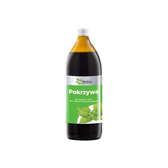 Sok EkaMedica Pokrzywa to suplement diety w formie płynu wyprodukowany z ekstraktu z liści pokrzywy. Płyn bez dodatku cukru oraz substancji konserwujących. Pokrzywa korzystnie wpływa na funkcjonowanie prostaty, zmniejsza uczucie ciężkich i zmęczonych nóg, wpływa na stan skóry problematycznej i skóry głowy, wspomaga krążenie żylne. Liść pokrzywy działa oczyszczająco, detoksykująco oraz moczopędnie - normalizuje funkcjonowanie dróg moczowych, nerek, gruczołu krokowego i woreczka zółciowego. Pokrzywa usuwa szkodliwe produkty przemiany materii pozwalajac pozbyć sie nadmiaru wody.