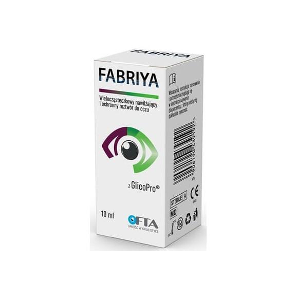 Fabriya to smarujący, ochronny, nawilżający, łagodzący i antyoksydacyjny roztwór do oczu, zawierający GlicoPro. Wspomaga również fizjologiczne procesy naprawcze rogówki oraz wspomaga przywrócenie funkcjonalności zakończeń nerwowych rogówki, która ulega zmniejszeniu u pacjentów z zespołem suchego oka.