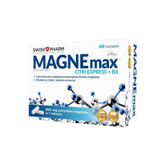 Swiss Pharm Magnemax Citri Express + B6 to suplement diet zawierający 640 mg cytrynianu magnezu, w tym 100 mg jonów magnezu w jednej tabletce. Produkt przeznaczony jest dla osób dorosłych.