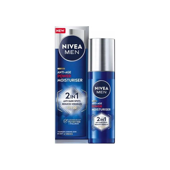 Nivea Men Anti-Age Power krem nawilżający to rewolucyjny produkt, który nie tylko zapewnia intensywne nawilżenie, ale również działa przeciwzmarszczkowo, zapobiega powstawaniu i rozjaśnia przebarwienia oraz zapewnia ochronę przeciwsłoneczną SPF 30. Jego unikalna formuła łączy kwas hialuronowy z opatentowanym składnikiem przeciw przebarwieniom LUMINOUS 630, zapewniając młodszy wygląd skóry już po 4 tygodniach stosowania. Delikatny dla skóry i odpowiedni dla każdej karnacji oraz typu skóry, w tym wrażliwej