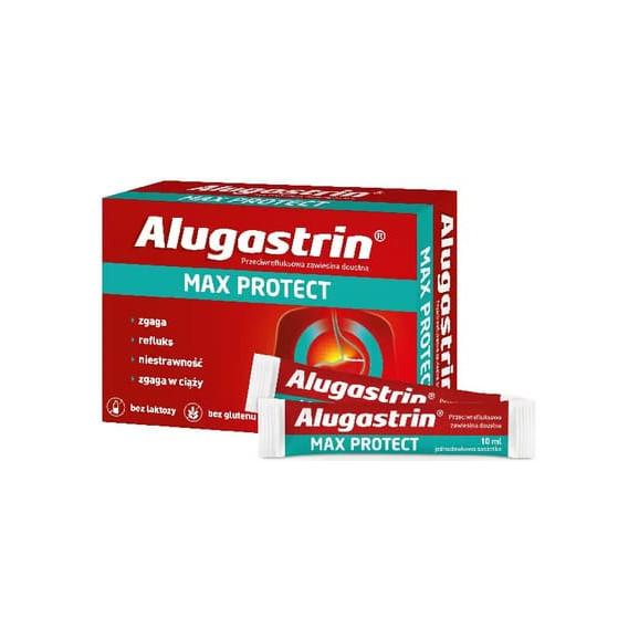 Alugastrin Max Protect to wyrób medyczny w postaci doustnej zawiesiny zamkniętej w jednodawkowych saszetkach po 10 ml w każdej. Produkt wskazany jest w leczeniu objawów refluksu żołądkowo-przełykowego. Wykazuje trzy synergiczne działania:
