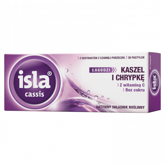 Pastylki do ssania Isla Cassis są wyrobem medycznym leczniczym, który stosuje się, by złagodzić objawy kaszlu i chrypki. Substancje zawarte w produkcie owlekają błonę śluzową gardła i krtani cieniutkim filmem ochronnym, broniącym ją przed szkodliwym wpływem czynników drażniących. Preparat ten jest odpowiedni dla dorosłych, w tym kobiet w ciąży i matek karmiących, oraz dla dzieci w wieku powyżej 4 lat.