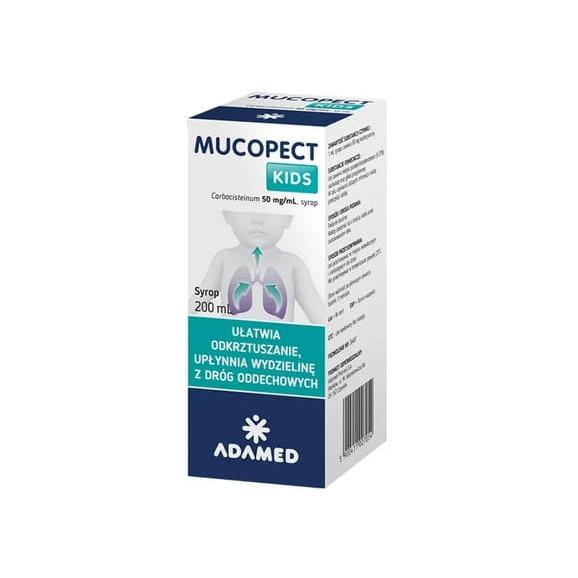 Mucopect Kids to lek w postaci syropu o bursztynowej barwie i słodkim, agrestowym smaku, który może być podawany u dzieci od 6 roku życia. Substancją czynną zawartą w leku jest karbocysteina będąca substancją z grupy "mukolityków", które są stosowane w chorobach układu oddechowego z nadmiernym wydzielaniem śluzu w oskrzelach. Substancja czynna zawarta w syropie zmniejsza lepkość śluzu i ułatwia jej odkrztuszanie w trakcie kaszlu.
