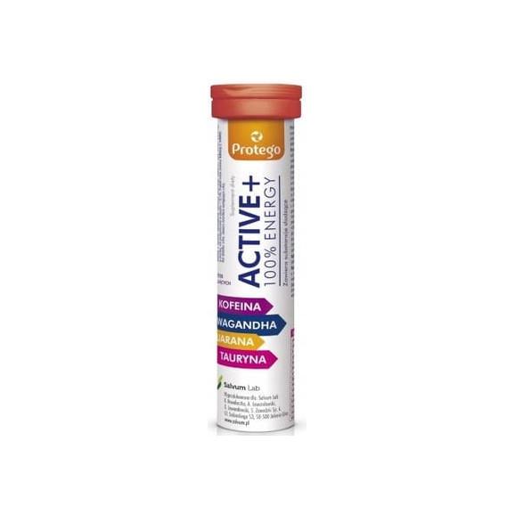 Protego Active + 100% Energy to suplement diety w postaci tabletek musujących zawierający ekstrakty roślinne pochodzenia naturalnego z guarany oraz ashwagandhy. Ponadto posiada kofeinę, taurynę, magnez oraz kompleks 10 witamin.