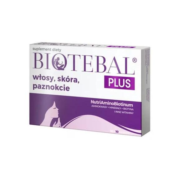 Biotebal Plus włosy, skóra, paznokcie to suplement diety, zawierający składniki wspierające kondycję oraz wygląd włosów, skóry i paznokci. Zawiera skoncentrowaną, odżywczą formułę NutriAminoBiotinum, bogatą w aminokwasy, składniki mineralne i witaminy - w tym biotynę. Odżywcza formuła NutriAminoBiotinum została opracowana na bazie odpowiednio wyselekcjonowanych składników, które mają korzystny wpływ na kondycję włosów, skóry i paznokci.