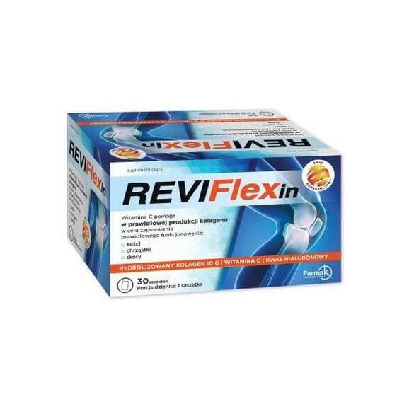 Suplement diety Nord Farm Reviflexin to produkt zawierający hydrolizowany kolagen, witaminę C oraz kwas hialuronowy w postaci rozpuszczalnego w wodzie proszku o smaku pomarañczowym.
