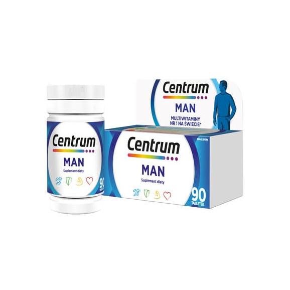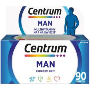 Centrum Man to suplement diety, którego formuła została opracowana w odpowiedzi na potrzeby odżywcze dorosłych mężczyzn. Każda tabletka to połączenie 13 witamin, w tym witamin z grupy B, witamin rozpuszczalnych w tłuszczach: A, D, E, K; witaminy C oraz 10 cennych składników mineralnych, wśród których jest: selen, miedź, cynk i chrom.