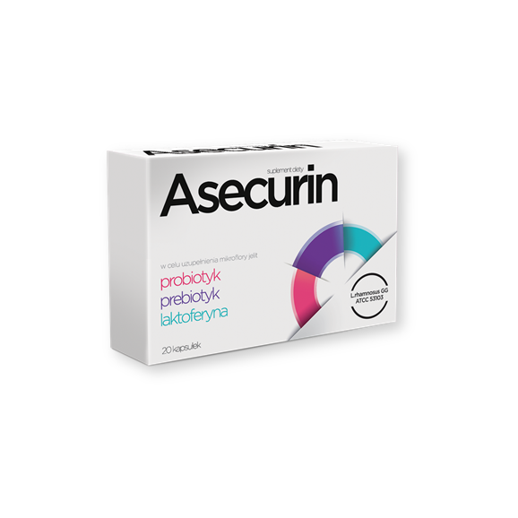 Asecurin - suplement diety zawiera trzy szczepy bakterii probiotycznych, prebiotyk i laktoferynę. Jest polecany w celu uzupełnienia mikroflory jelit dla dorosłych i dzieci powyżej 3 roku życia.