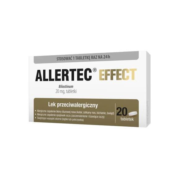 Allertec Effect stosuje się u dorosłych i młodzieży w wieku 12 lat i powyżej w celu złagodzenia objawów kataru siennego (katar, zatkany nos, kichanie, świąd oraz zaczerwienione i łzawiące oczy) oraz innych postaci alergicznego zapalenia błony śluzowej nosa i alergicznego zapalenia spojówek (obrzęk, świąd, zaczerwienione i łzawiące oczy). Lek może być również stosowany do leczenia swędzących wysypek skórnych (bąble lub pokrzywka). Bilastyna hamuje powstawanie bąbli oraz zaczerwienienia skóry przez 24 godziny po przyjęciu pojedynczej dawki, dzięki czemu poprawia się jakość snu i jakość życia.