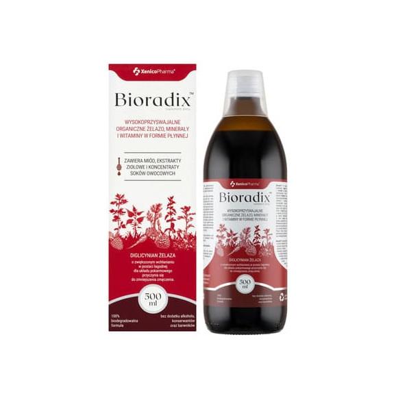 Bioradix zawiera w swoim składzie kompozycję miodu wielokwiatowego, naturalnych ziołowych i standaryzowanych ekstraktów, koncentratów owocowych oraz zestaw minerałów, w tym: organiczne żelazo, wapń, potas, fosfor, magnez, cynk, mangan, miedź oraz chrom. Dodatkowo preparat został wzbogacony o witaminy: B1, B2, B6, aktywną witaminę B12 w postaci metylokobalaminy oraz witaminę C – składnik zwiększający przyswajanie żelaza.