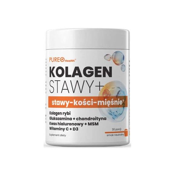 Pureo Health® Kolagen Stawy+ to suplement diety w proszku o smaku neutralnym na bazie kolagenu rybiego, z dodatkiem glukozaminy, chondroityny, kwasu hialuronowego, MSM oraz witamin C i D.