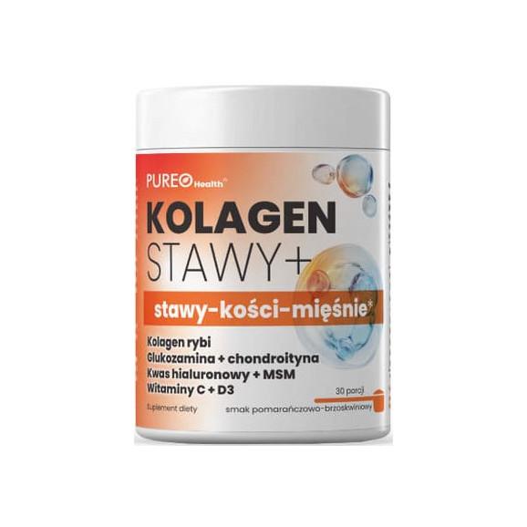 Pureo Health® Kolagen Stawy+ to suplement diety w proszku o smaku pomarańczy i brzoskiwni na bazie kolagenu rybiego, z dodatkiem glukozaminy, chondroityny, kwasu hialuronowego, MSM oraz witamin C i D.