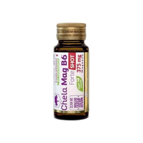 Chela-Mag B6 Forte Shot o smaku wiśniowym to suplement diety w postaci ampułek z płynem zawierający wysoko przyswajalną płynną formę magnezu w postaci chelatu aminokwasowego w zwiększonej dawce, wzbogaconego witaminą B6, która współpracuje z magnezem w procesach metabolicznych i wzmacnia jego działanie.