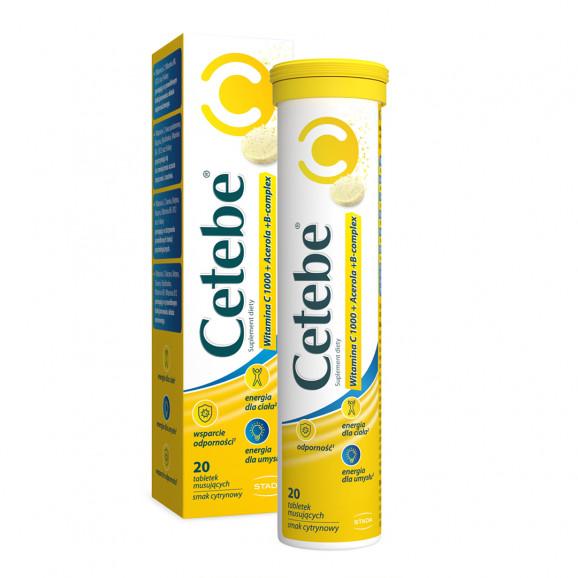 Cetebe® Witamina C 1000 mg + Acerola + B-complex to suplement diety w formie tabletek musujących, przeznaczony do codziennej suplementacji dla osób dorosłych.