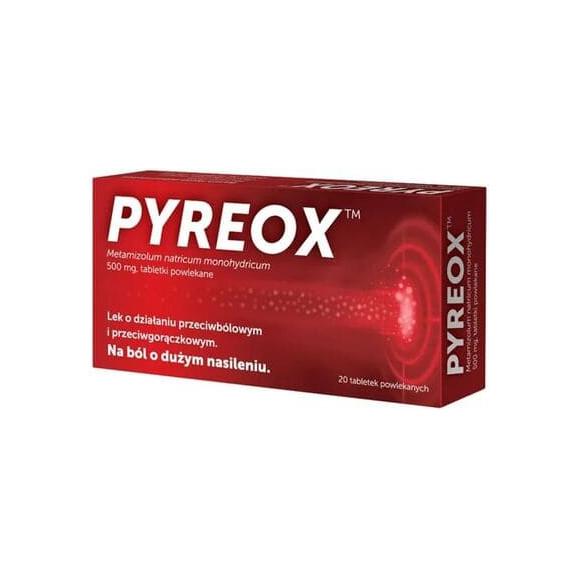 Pyreox to lek w postaci tabletek powlekanych, zawierający w składzie metamizol sodowy jednowodny. Pyreox wykazuje działanie przeciwbólowe (łagodzące ból), przeciwgorączkowe (zmniejszające gorączkę) oraz rozkurczowe (łagodzące skurcze mięśni gładkich).