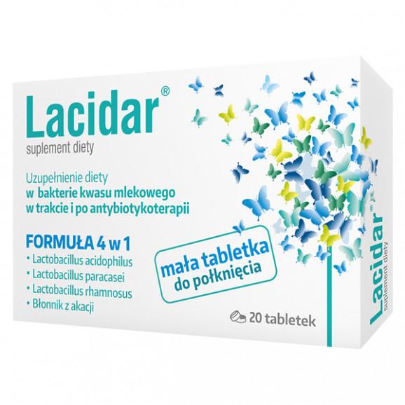 Lacidar to suplement diety zawierający 3 szczepy liofilizowanych kultur bakterii kwasu mlekowego z rodzaju Lactobacillus oraz rozpuszczalny błonnik z akacji. Ma postać niewielkich rozmiarów, łatwych do połknięcia tabletek.