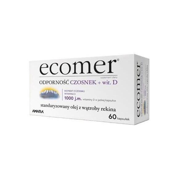 Ecomer Odporność Czosnek + witamina D3 to suplement diety w postaci żelowych kapsułek zawierających olej z wątroby rekina macerat olejowy z czosnku oraz witaminę D3. Jest odpowiedni jako codzienne uzupełnienie diety całej rodziny, w tym dzieci powyżej 3 roku życia.
