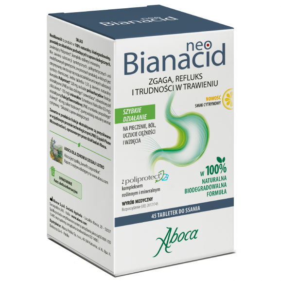 NeoBianacid Nadkwaśność i Refluks jest wyrobem medycznym na bazie roślinnych i mineralnych kompleksów molekularnych, który tworzy na błonie śluzowej warstwę o efekcie bariery, chroniącej błonę przed kontaktem z sokami żołądkowymi i substancjami podrażniającymi. Zawiera poliprotect, kompleks molekularny, który dzięki swym właściwościom odtwarza ochronne działanie śluzu fizjologicznego.