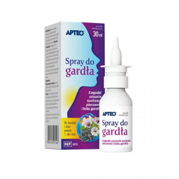 Wyrób medyczny Spray do gardła APTEO dzięki obecności składników powlekających błonę śluzową jamy ustnej i gardła łagodzi uczucie suchości, pieczenia i bólu gardła, zwłaszcza w czasie przełykania.