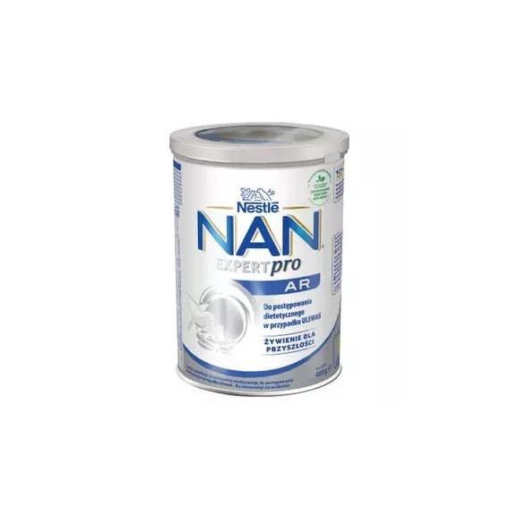 Nestle NAN Expert Pro AR to żywność specjalnego przeznaczenia medycznego do postępowania dietetycznego w przypadku ulewań przeznaczony dla niemowląt od pierwszego dnia życia do 12 miesiąca, które z różnych przyczyn nie mogą być karmione piersią. Produkt w składzie zawiera częściowo hydrolizowane białko oraz kultury bakterii L., a ponadto został zagęszczony skrobią ziemniaczaną, co pozytywnie wpływa na ograniczenie ulewania przez dziecko.