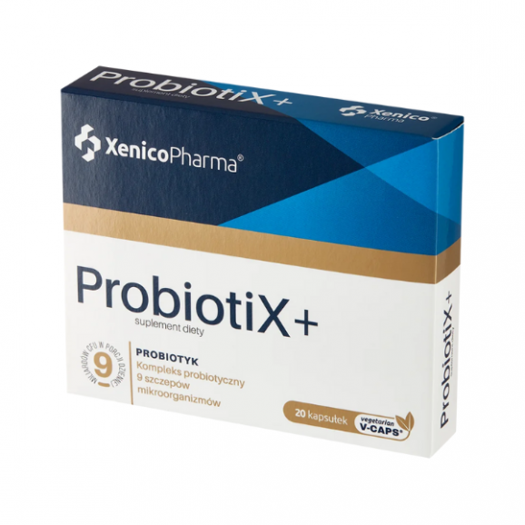 ProbiotiX+ to kompleksowy i nowoczesny probiotyk zawierający aż 9 szczepów żywych mikroorganizmów w ilości 9 miliardów w porcji dziennej, zdolnych do optymalnego zasiedlenia przewodu pokarmowego i „harmonizacji“ mikroflory jelit. ProbiotiX+ powstał z zastosowaniem opatentowanej technologii DRcaps® w postaci kapsułek rozpuszczalnych w jelitach o powolnym uwalnianiu, które zabezpieczają przed niszczącym działaniem kwasów i enzymów trawiennych w żołądku. Kapsułki DRcaps® pozwalają szczepom probiotycznym bezpieczne dotrzeć do jelit.