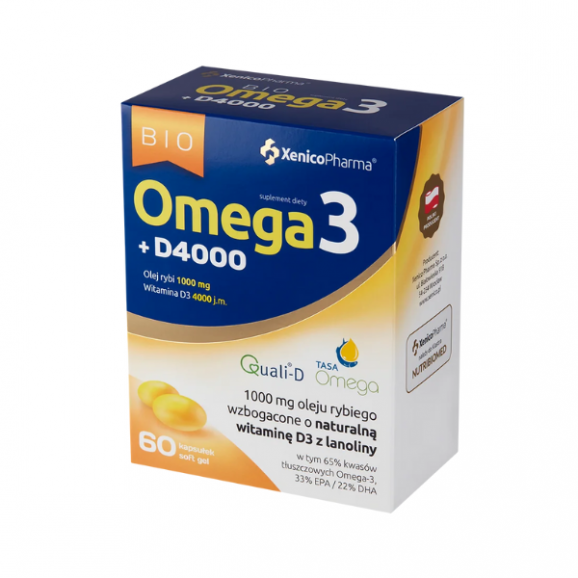 Bio Omega3 + D3 4000 to wysokiej jakości suplement diety zawierający w jednej kapsułce 1000 mg (w tym 65% Omega-3) skoncentrowanego oleju peruwiańskich ryb zimnowodnych (TASA OmegaTM). Jest także źródłem naturalnej witaminy D3 pozyskiwanej z lanoliny (Quali-D®). Witamina D3 zawarta w preparacie została rozpuszczona w naturalnych tłuszczach dzięki czemu jest najlepiej przyswajalna dla organizmu.
