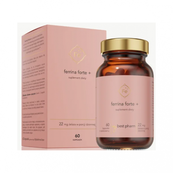 Ferrina Forte+ MyBest Pharm to suplement diety w postaci kapsułek, odpowiedni do stosowania jako uzupełnienie diety osób dorosłych, w tym kobiet, które mają obfite miesiączki. Zawiera starannie dobraną kompozycję organicznych, dobrze przyswajalnych form żelaza: