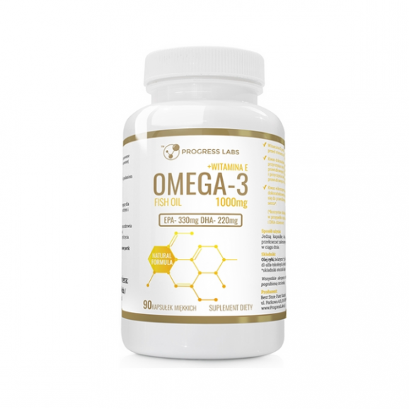 Progress Labs Omega-3 1000 mg + witamina E to suplement diety w postaci kapsułek żelatynowych przeznaczony dla osób dorosłych. Produkt uzupełnia codzienną dietę, a jego korzystny efekt wynikający z deklarowanego działania występuje w przypadku spożycia 1 kapsułki dziennie.