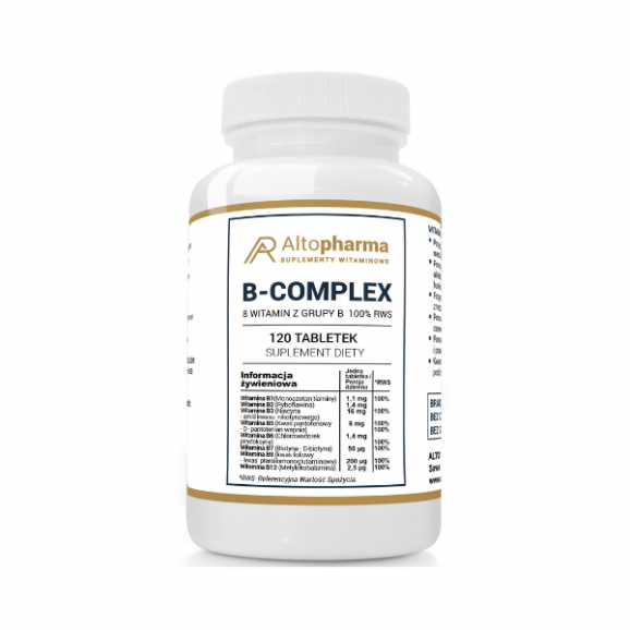 Altopharma Witamina B Complex 100% RWS to suplement diety dedykowany osobom pragnącym wzbogacić swoją suplementację o witaminy z grupy B, tj. B1, B2, B3, B5, B6, B7, B9 i B12. Jego zalecana dobowa porcja, czyli 1 tabletka, pokrywa dzienne zapotrzebowanie przeciętnej osoby dorosłej na witaminy z grupy B (RWS 100%).