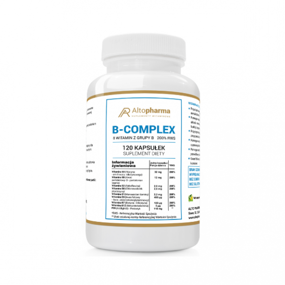 Altopharma Witamina B Complex 200% RWS to suplement diety dedykowany osobom pragnącym wzbogacić swoją suplementację o witaminy z grupy B, tj. B1, B2, B3, B5, B6, B7, B9 i B12. Jego zalecana dobowa porcja, czyli 1 tabletka, pokrywa dzienne zapotrzebowanie przeciętnej osoby dorosłej na witaminy z grupy B (RWS 200%).