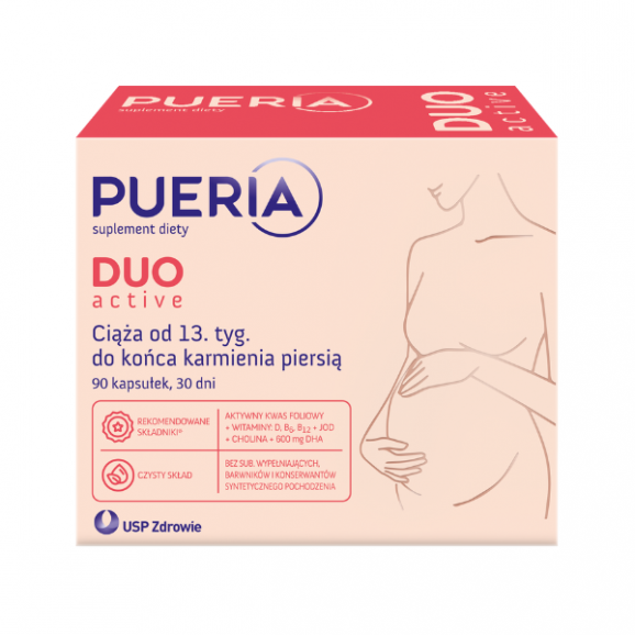 Pueria Duo Active to suplement diety przeznaczony dla kobiet w II trymestrze ciąży i karmiących piersią. Preparat ma formę dwóch różnych kapsułek: z witaminami i minerałami oraz z kwasami Omega-3.