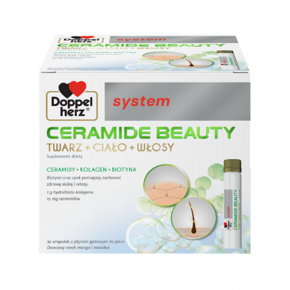 Doppelherz® System Ceramide Beauty to suplement diety w formie ampułek z płynem o owocowym smaku mango i marakui. Preparat sprawdzi się jako uzupełnienie codziennej diety osób dorosłych, w szczególności tych, które pragną od wewnątrz wspierać zdrowie swojej skóry1 i włosów3. Łączy w sobie wyjątkową kompozycję ceramidów z hydrolizowanym kolagenem oraz starannie dobrane witaminy i składniki mineralne.