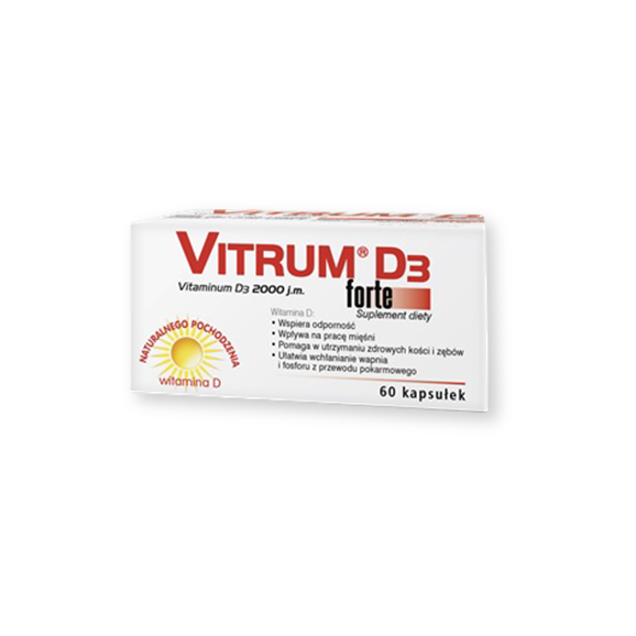 Vitrum D3 Forte - suplement diety, zawierający witaminę D naturalnego pochodzenia, która wspiera odporność, funkcjonowanie kości i zębów i metabolizm wapnia oraz fosforu. Produkt przeznaczony dla dorosłych, kobiet w ciąży, w okresie karmienia piersią i osób powyżej 60 lat. Opakowanie zawiera 60 sztuk.