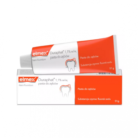 - Lek elmex Duraphat ma dużą zawartość fluoru. Podczas stosowania leku elmex Duraphat należy unikać przyjmowania tabletek, kropli, gumy do żucia, żelów lub lakierów zawierających fluor, a także fluorowanej wody lub soli. Aby zapobiec kumulacji fluoru w organizmie, przed rozpoczęciem stosowania pasty zawierającej fluor należy ocenić całkowitą ilość przyjmowanego fluoru.