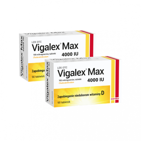 Vigalex® Max to lek zawierający witaminę D3 w postaci cholekalcyferolu. Produkt leczniczy ma formę małych, łatwych do połknięcia tabletek, a każda z nich zawiera 4000 IU substancji czynnej. Tabletki Vigalex® Max nie zawierają żelatyny, dlatego lek ten jest odpowiedni dla osób na diecie wegetariańskiej.