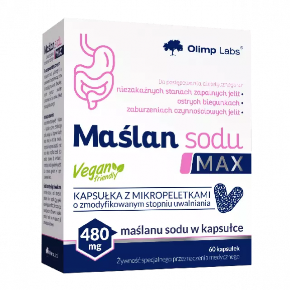 Wyniki badań klinicznych pokazują jednak, że u pacjentów z niektórymi problemami ze strony przewodu pokarmowego (np. zespół jelita drażliwego, choroba Leśniowskiego-Crohna, wrzodziejące zapalenie jelita grubego) stężenie kwasu masłowego jest znacząco obniżone. Preparat Olimp Maślan sodu MAX to kapsułki zawierające solidną porcję maślanu sodu, który jest źródłem wartościowego kwasu masłowego. Tym samym produkt może zostać wykorzystany jako element postępowania dietetycznego w przypadku wspomnianych niedogodności pokarmowych.