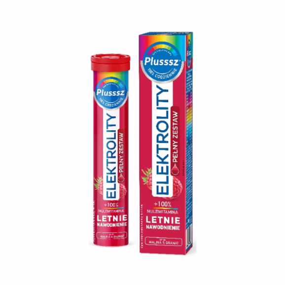 Plusssz Elektrolity Pełny Zestaw + 100% Multiwitamina Letnie Nawodnienie, smak malina & granat, tabletki musujące, 24 szt.