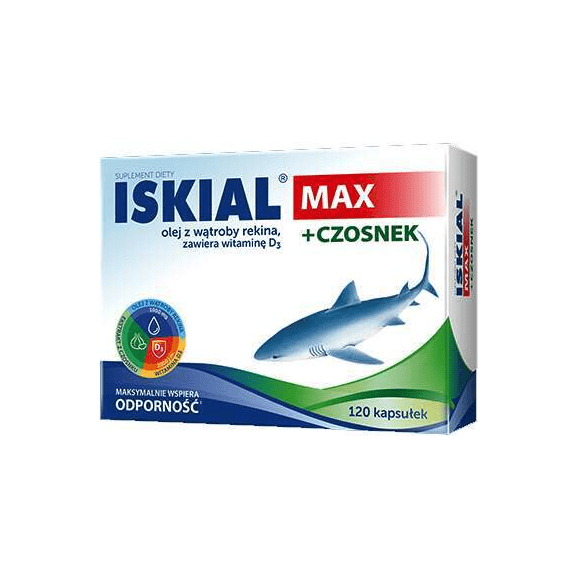 Iskial MAX + Czosnek to kompleksowa formuła, która łączy w sobie maksymalną zawartość oleju z wątroby rekina, witaminy D3 oraz skoncentrowany wyciąg z czosnku.