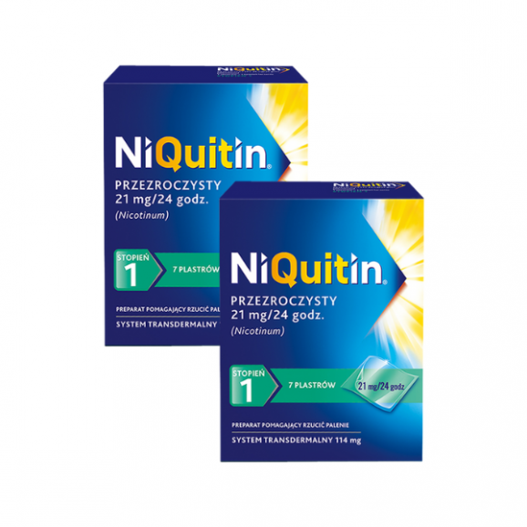 NiQuitin Przezroczysty 21 mg/24 godz. przeznaczony jest dla osób palących więcej niż 10 papierosów dziennie i stanowi pierwszy stopień kuracji, która łącznie trwa 10 tygodni (kuracja 3-stopniowa). Plastry mogą być stosowane samodzielnie lub w połączeniu z innymi postaciami doustnymi NiQuitin®.
