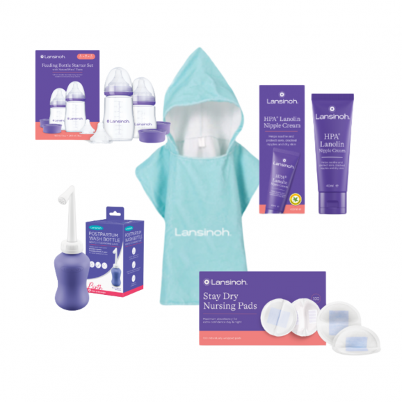 Zestaw Lansinoh, butelki do karmienia, butelka do podmywania, wkładki laktacyjne, maść na brodawki + poncho, 1 szt.