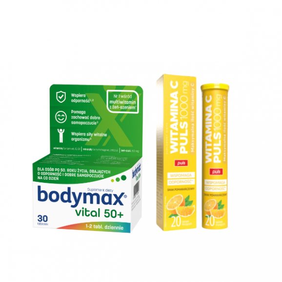 Ten zestaw łączy Bodymax Vital 50+ – suplement diety z kompleksem witamin, minerałów i żeń-szenia, stworzony specjalnie dla osób po 50. roku życia – z PULS Witamina C Puls 1000 mg, w formie wygodnych tabletek musujących o orzeźwiającym smaku pomarańczowym.