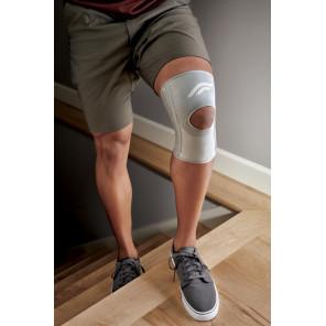 Wyposażony w wzmocnienia boczne, stabilizuje staw bez ograniczania ruchu. Otwór na rzepkę zapewnia dodatkowy komfort, a oddychający materiał pozwala na noszenie przez dłuższy czas bez uczucia dyskomfortu.