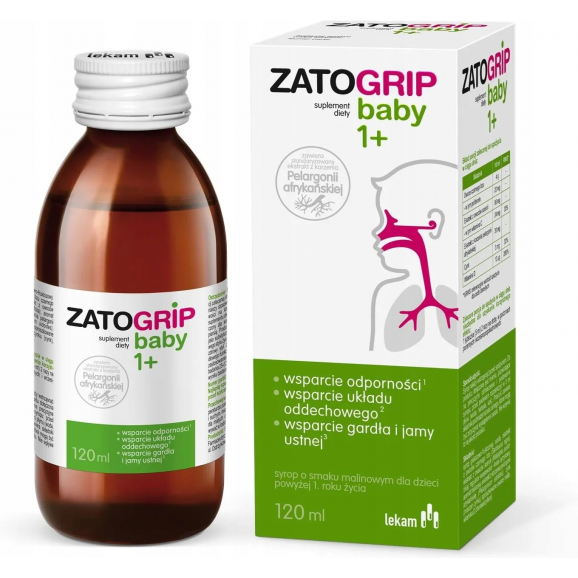 Zatogrip baby 1+ to podwójna siła dzięki połączeniu standaryzowanych ekstraktów roślinnych z korzenia pelargonii afrykańskiej oraz owoców czarnego bzu.